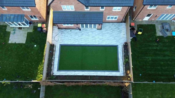 We installed Elite Artificial Grass to the front garden for a sharp, premium finish, and Eden Artificial Grass to the rear to create a softer, family-friendly lawn. Porcelain tiling and lighting completed the look, delivering a space that feels both luxurious and highly usable.