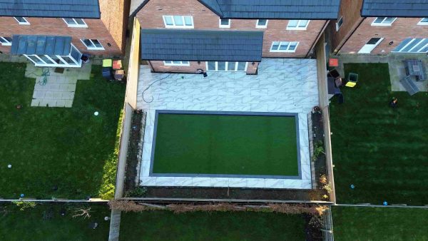 The property originally featured a standard new-build garden layout that required regular mowing and upkeep — something the homeowner simply didn’t have time for due to frequent overseas travel and a young family.